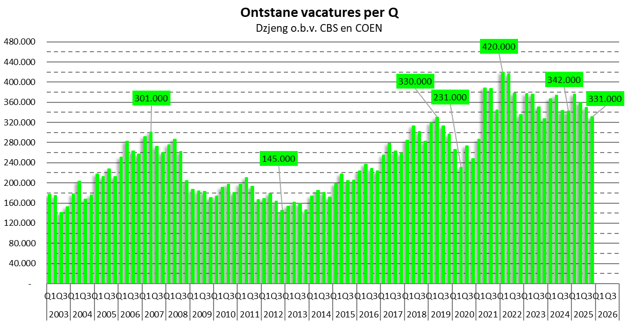 In Q4 ontstonden er 331.000 nieuwe vacatures, minder dan een kwartaal eerder én minder dan een jaar eerder. De trend lijkt daarmee net een tikkeltje negatief.
