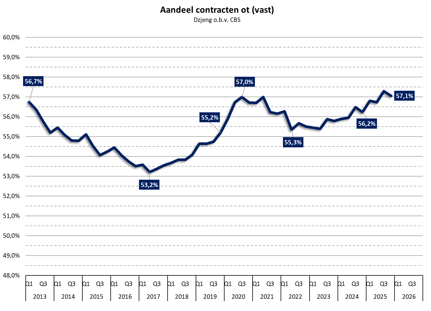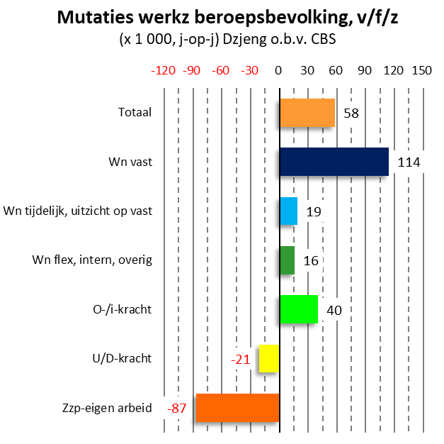 De omvang van de werkzame beroepsbevolking is in Q4 gestegen naar 9,867 miljoen personen, het grootste aantal ooit. Van hen hadden 5,63 miljoen een vast contract (een contract voor onbepaalde tijd), ofwel 57,1% – net iets lager dan de records van het derde kwartaal. Het aantal werknemers met een vast contract groeide in Q4 met 114.000 ten opzichte van een jaar eerder, dat was +2,1%, beduidend harder dan de +0,6% van de totale werkzame beroepsbevolking.